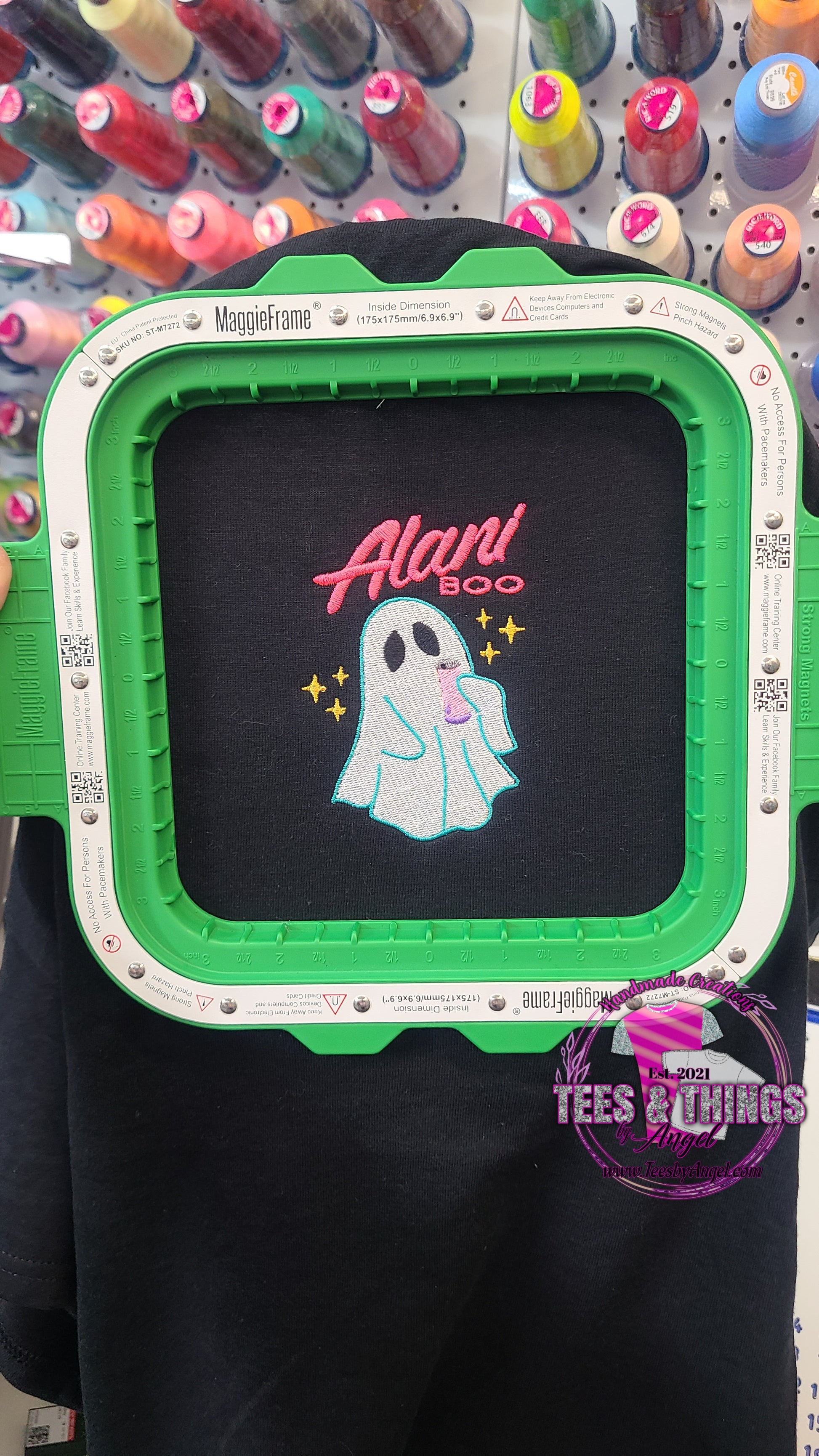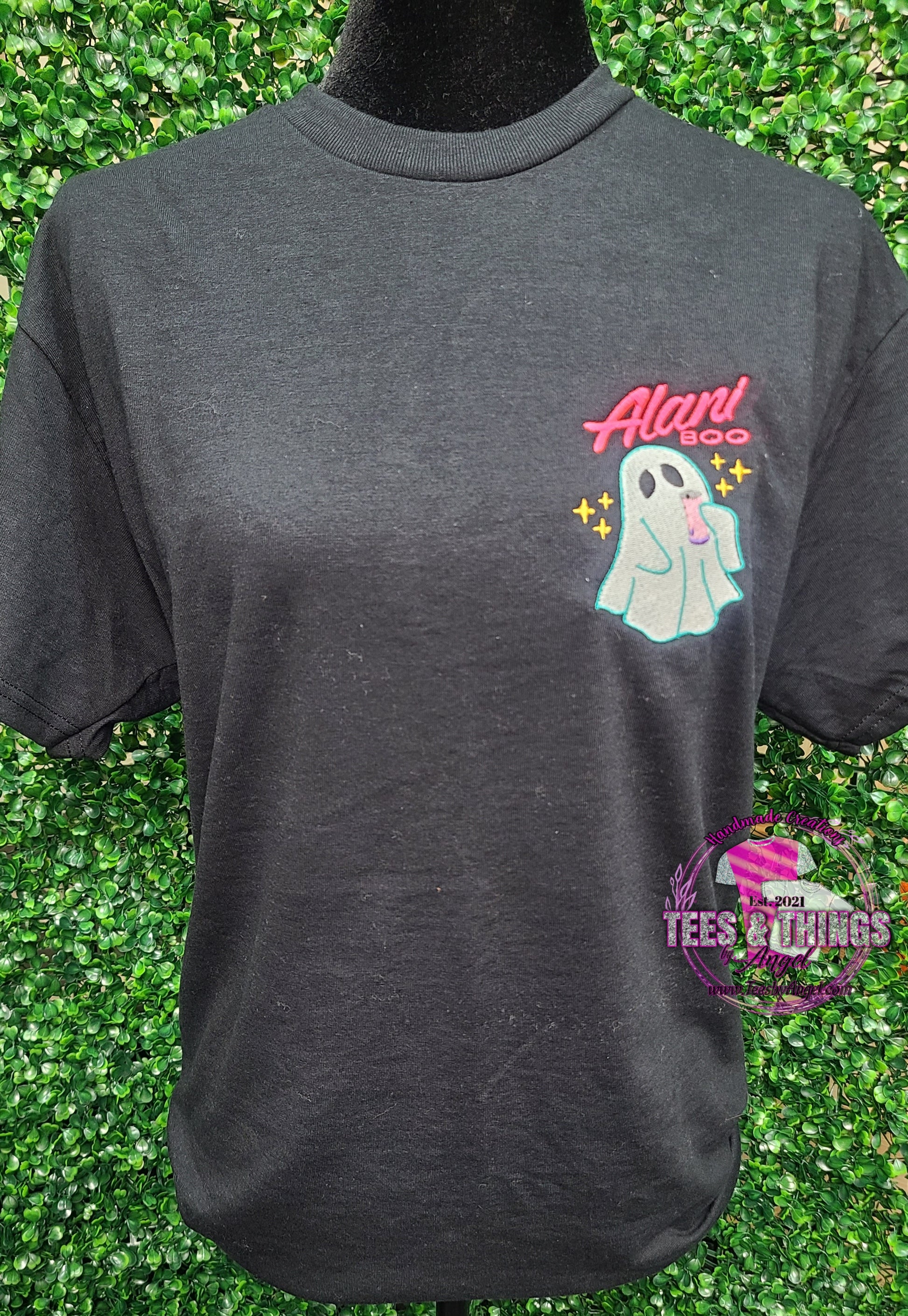 Embroidered Teeshirt with a cute little ghost holding an Alani can... Perfect for Spooky Season or every day wear. 🩷