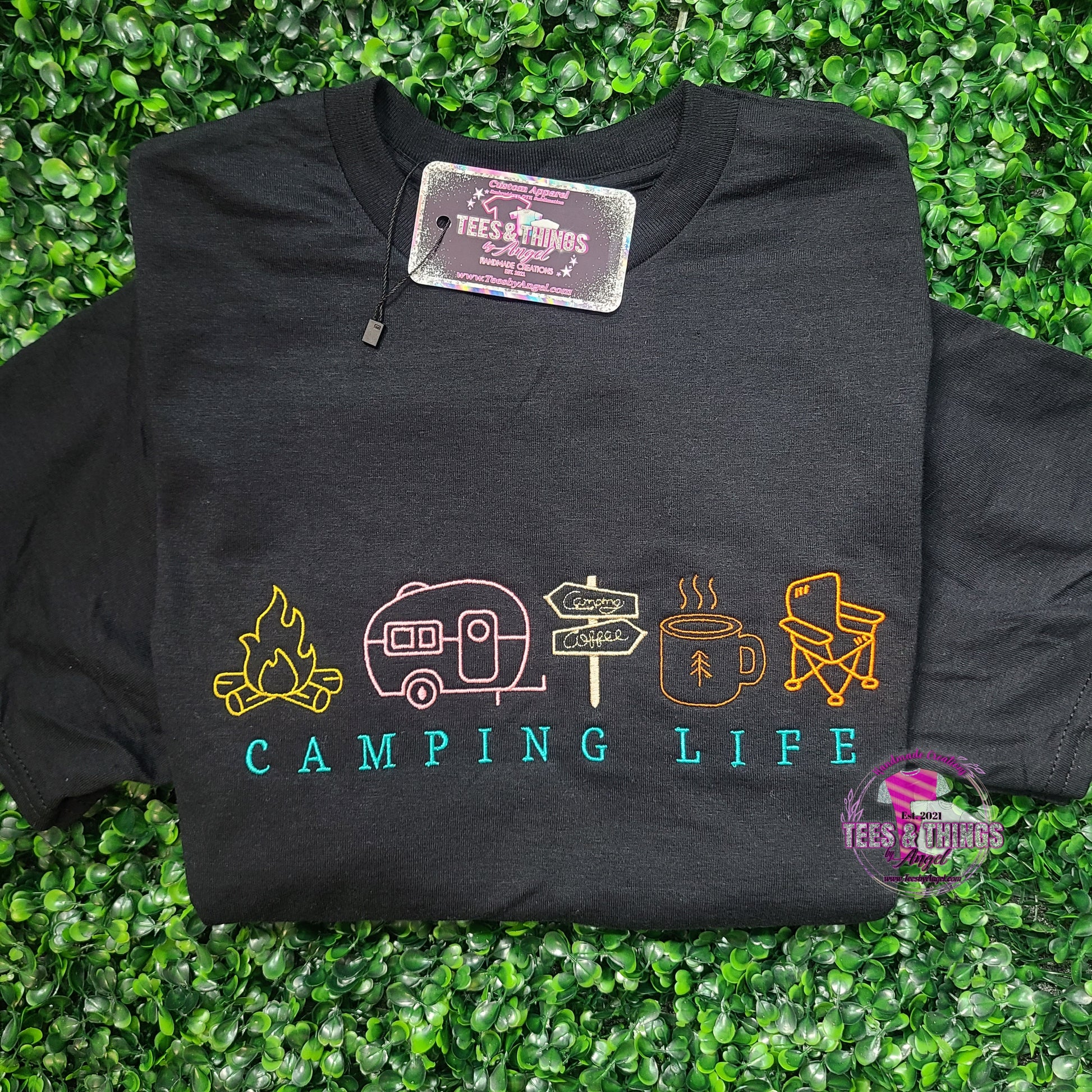 This adorable embroidered Camping Life Icons teeshirt can be customized with your favorite saying or campground, example: Twin Lakes Campground, Big Bear, Kick Back 'n' Camp, or leave it as is... Camping Life!