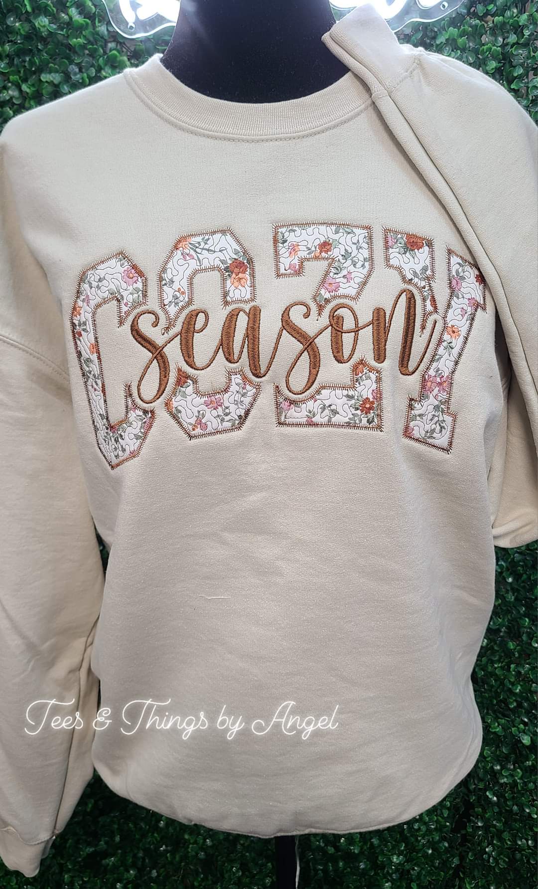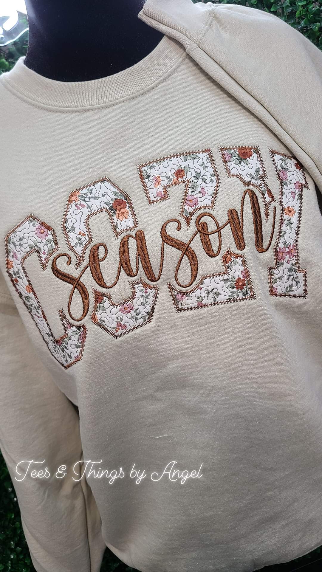Cozy Season embroidered sweatshirt with floral fabric inlay with a quilted pattern look.