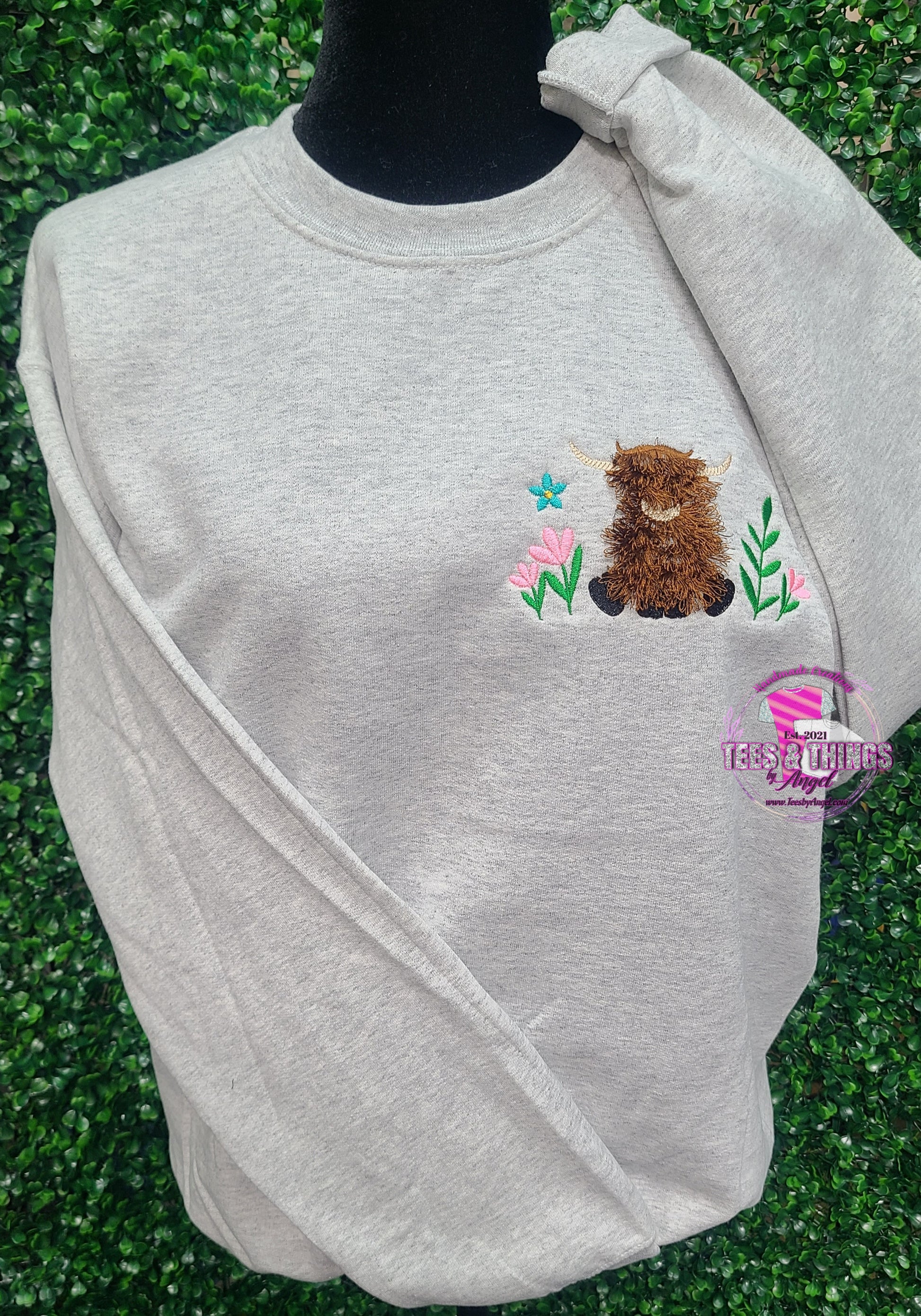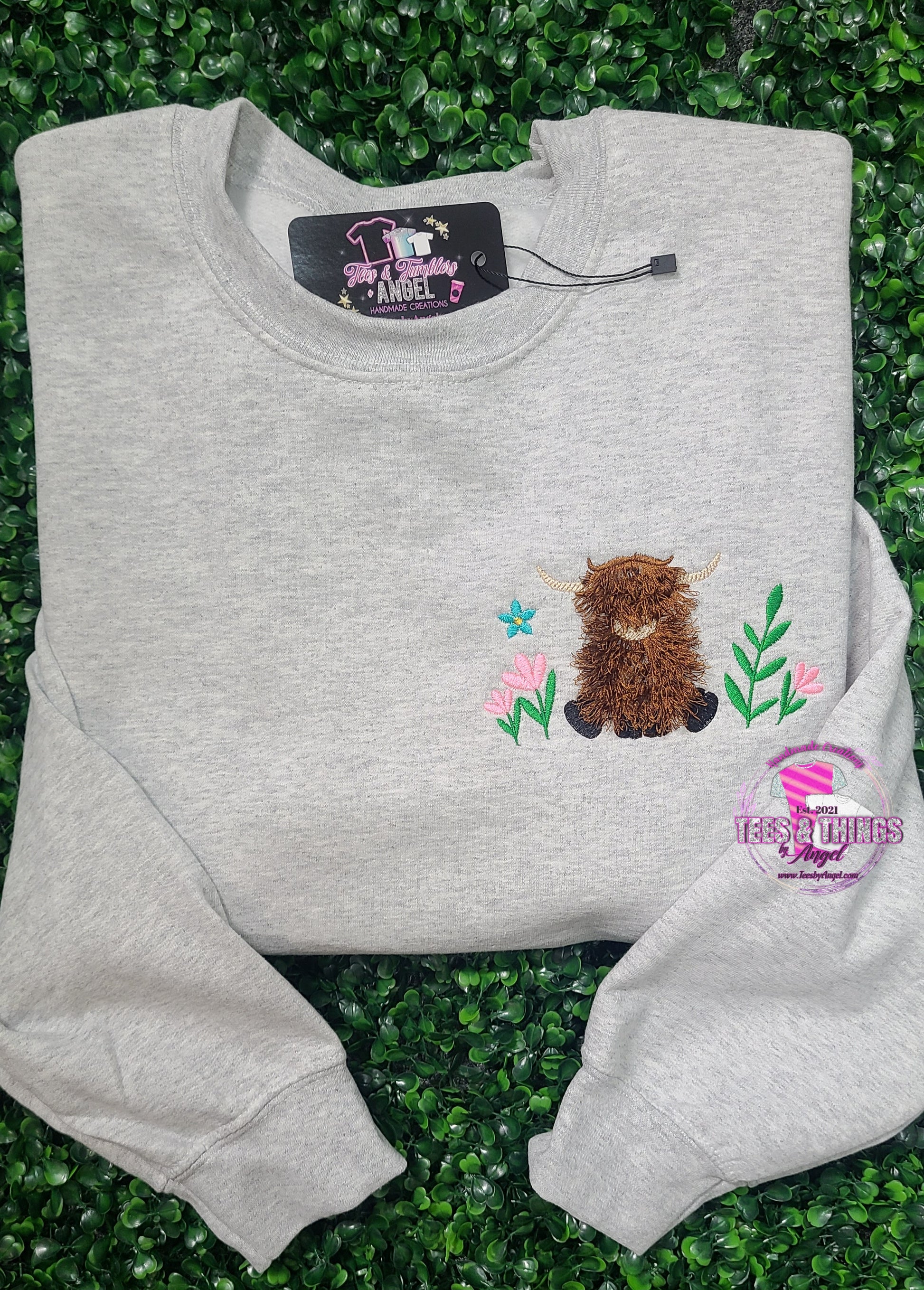 This is a must have for all cow lovers... Embroidered fluffy fringed highland cow accented with cute flowers.