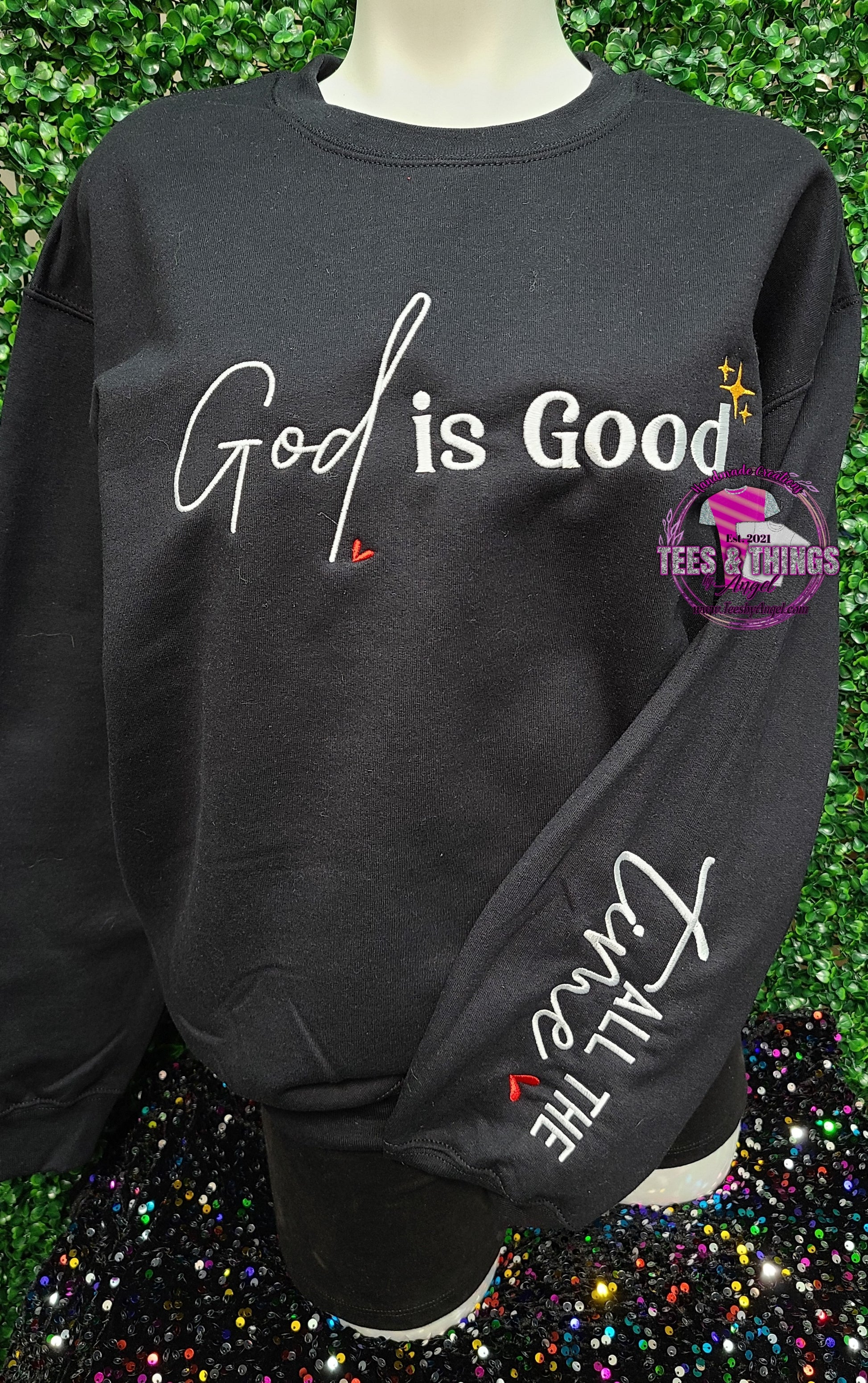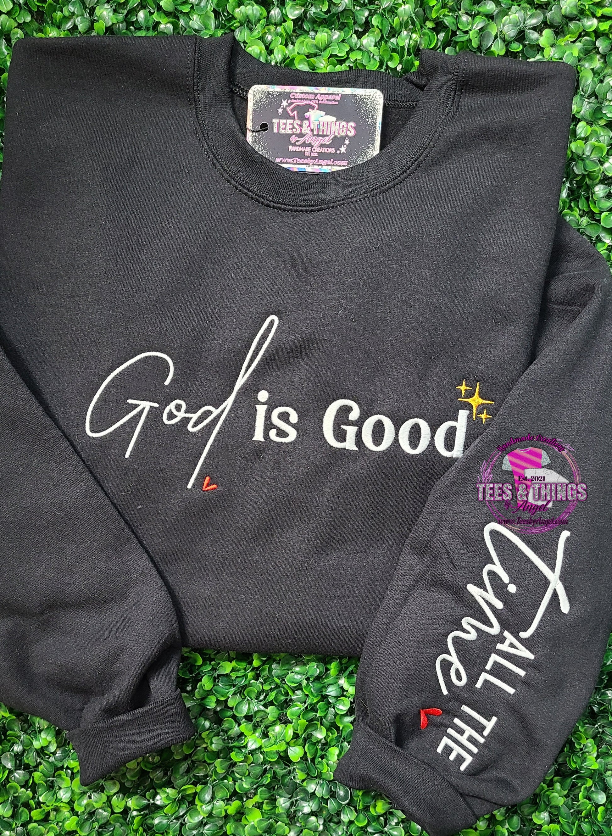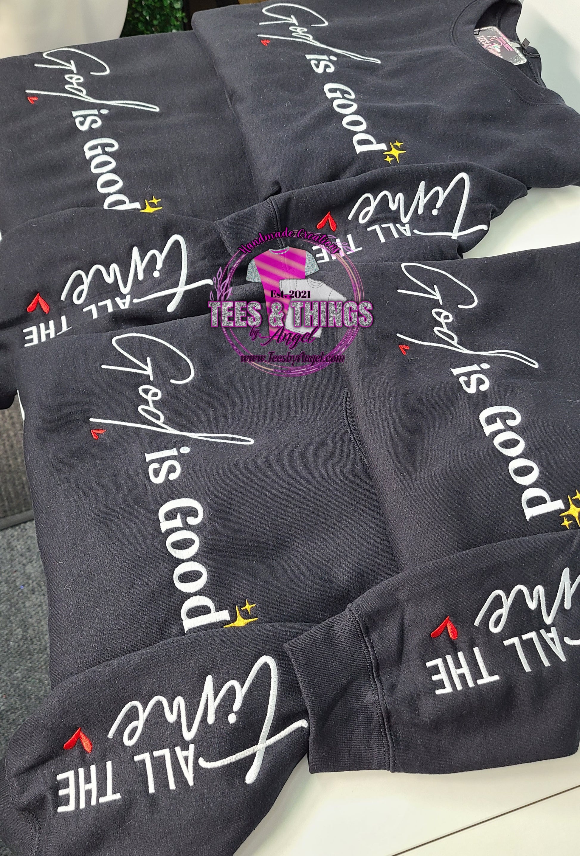 This sweatshirt is Embroidered with God is Good on the chest and the sleeve is also Embroidered with All the time ❤️.