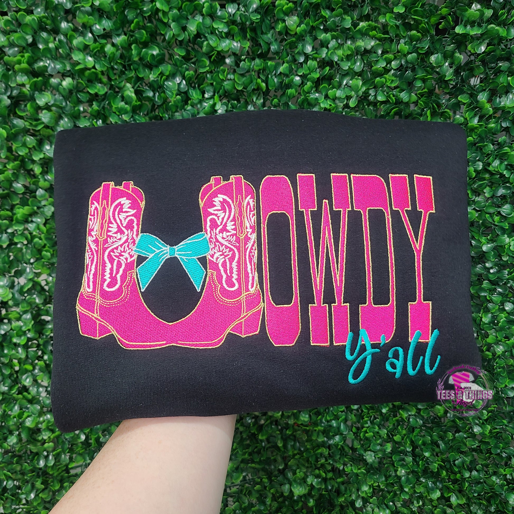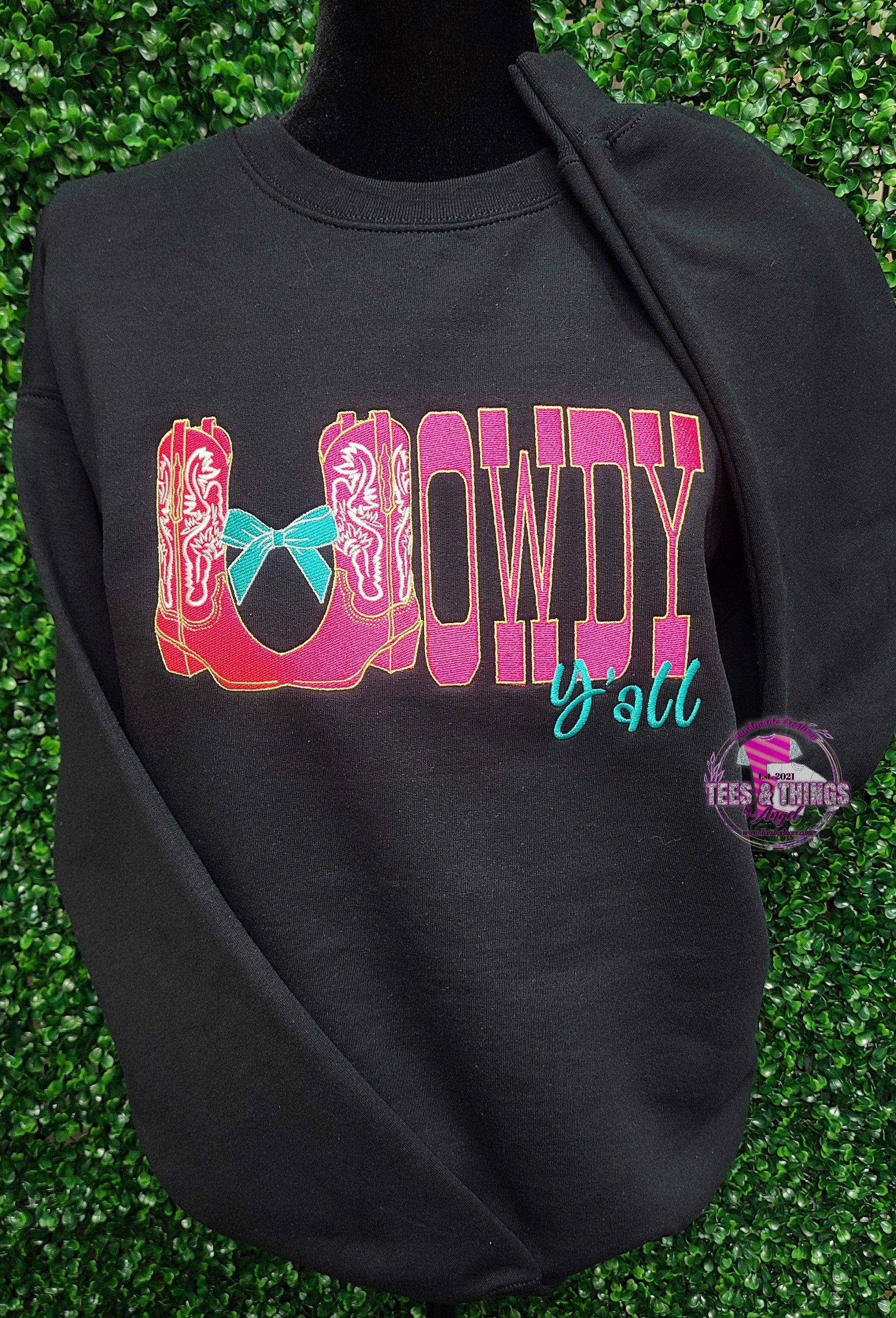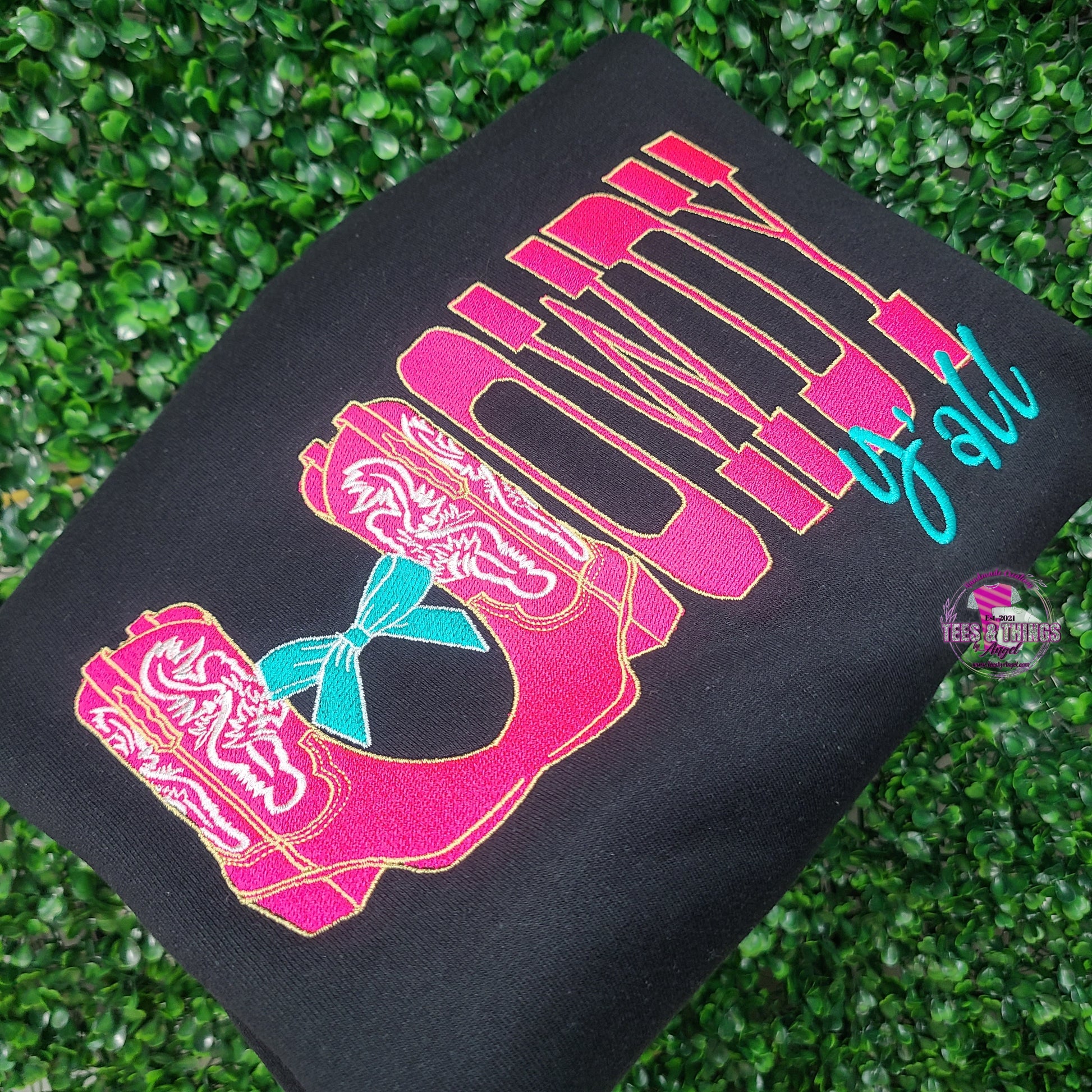 Embroidered Howdy Y'all sweatshirt in beautiful bright Pink, Gold, and Teal thread colors.