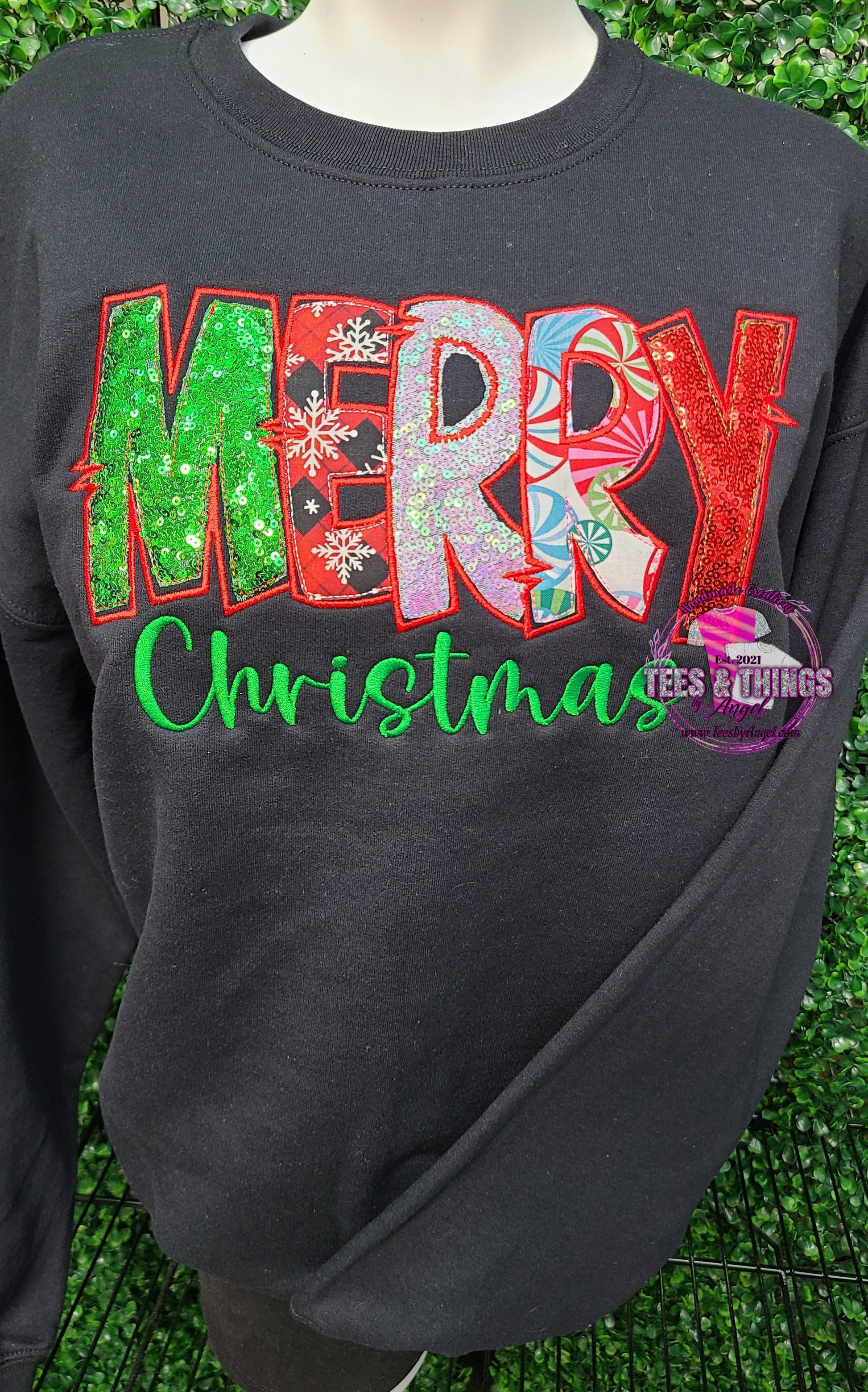 This adorable embroidered Merry Christmas sweatshirt is a must have. It is embroidered with both sequin fabric and Christmas fabric giving it a cure and very unique look.