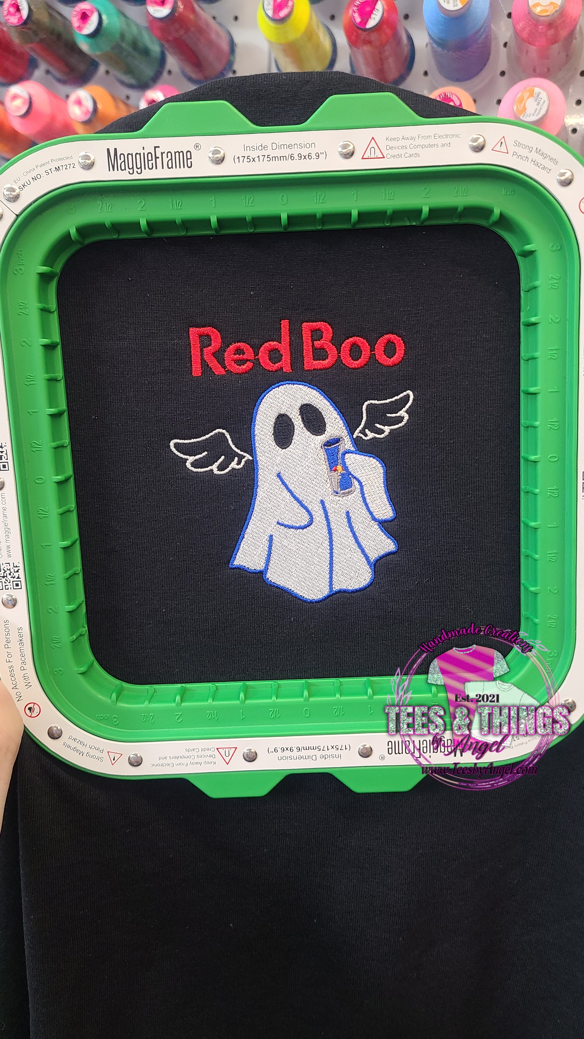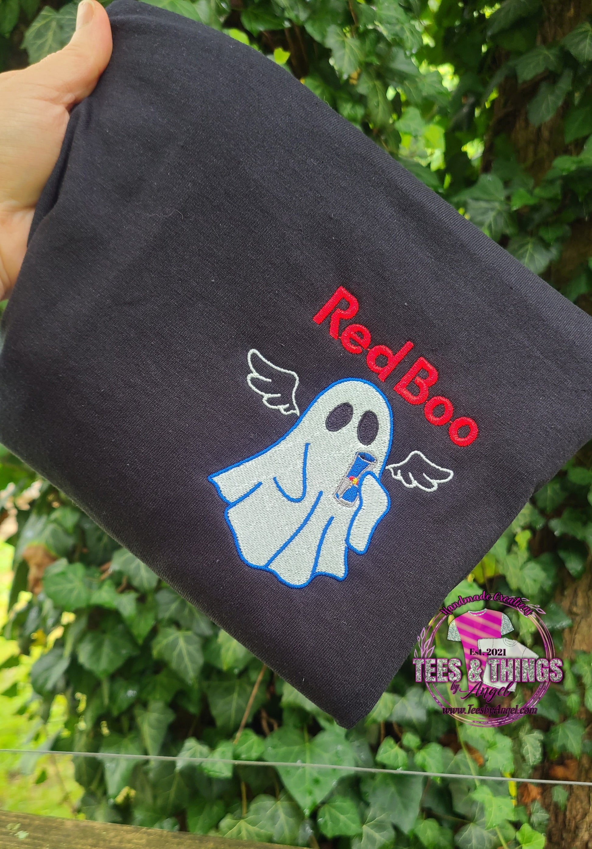 Adorable Embroidered Red Boo (Red Bull) ghost holding a Red Bull can, this is a pocket sized design and can be on a teeshirt or sweatshirt.Â