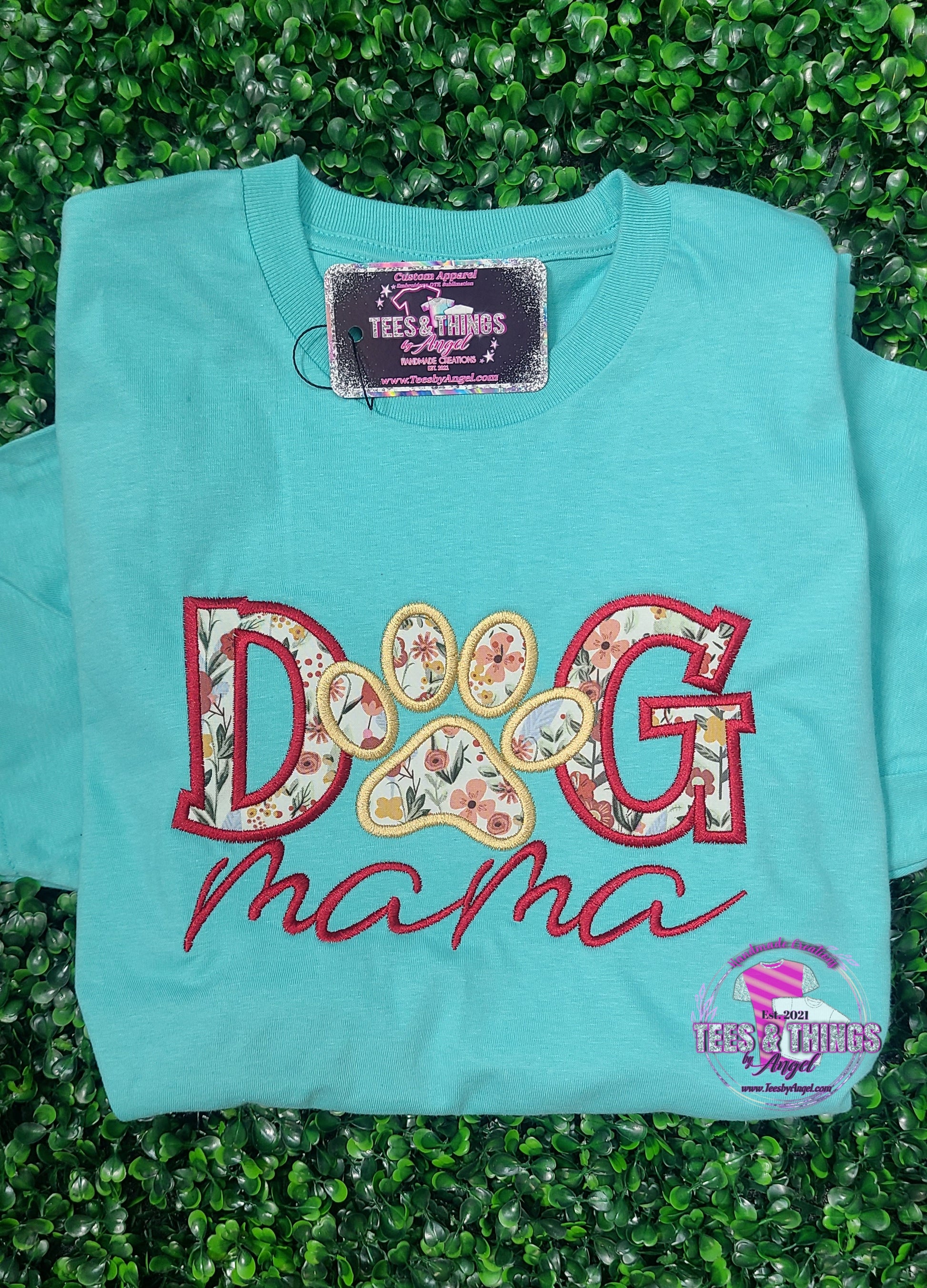 Beautiful Dog Mama embroidered teeshirt with a gorgeous floral fabric inlay.