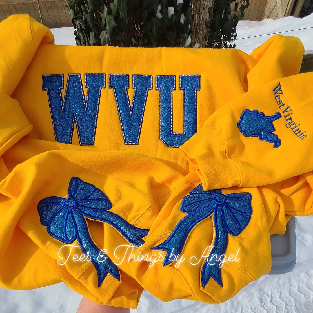 Embroidered WVU sweatshirt with slit embroidered sidebows on each side and embroidered West Virginia and the state silhouette on the sleeve cuff all in glitter! 💙💛